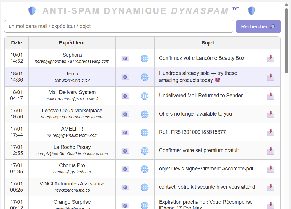 Ci-dessous une vue des mails que Dynaspam bloque. Il s’agit principalement d’arnaques :